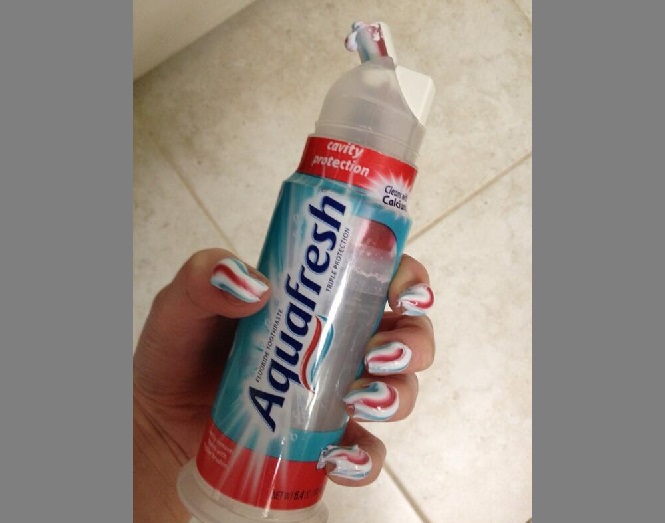 | Pizza night is accented here with a great grape nail lacquer, smiled with rhinestones. |